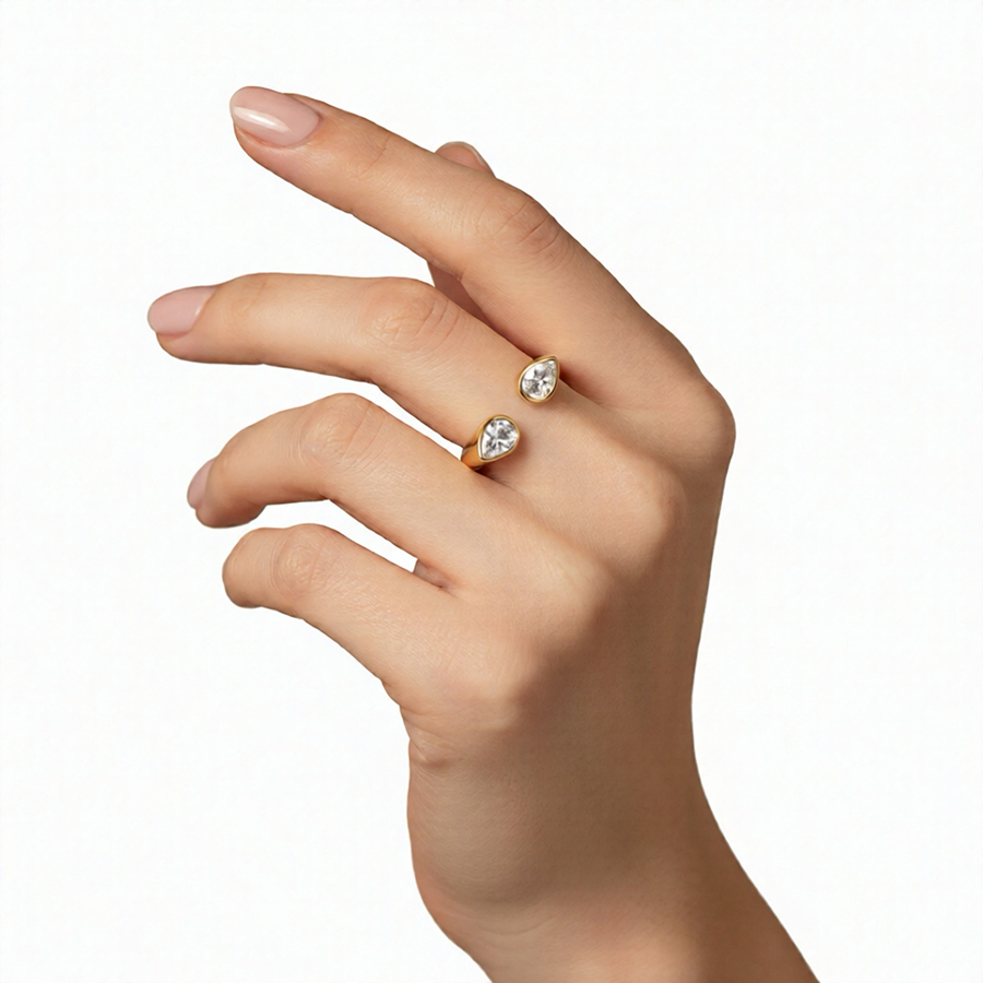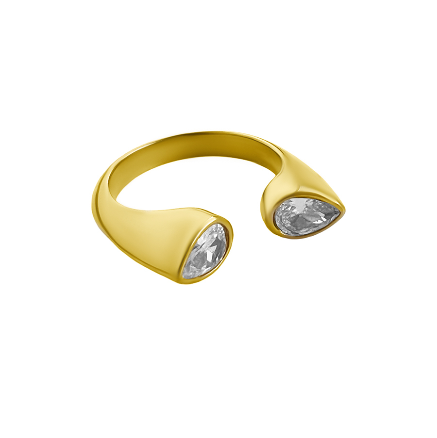 Роскошное кольцо из полированной стали , инкрустировано двумя крупными кристаллами в форме капли.