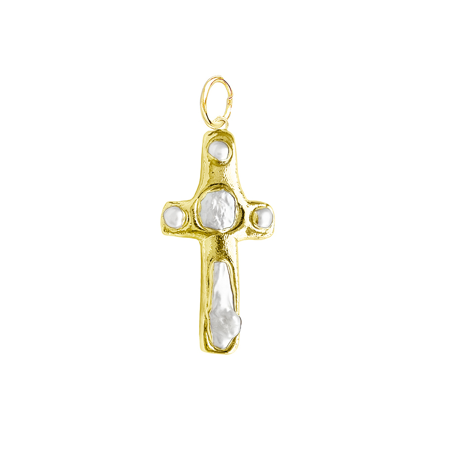 Подвеска в форме креста неправильной формы выполнена вручную из полимера, инкрустирована пятью крупными культивированными пресноводными жемчужинами разной формы. Окантована гальваническим золочением.
