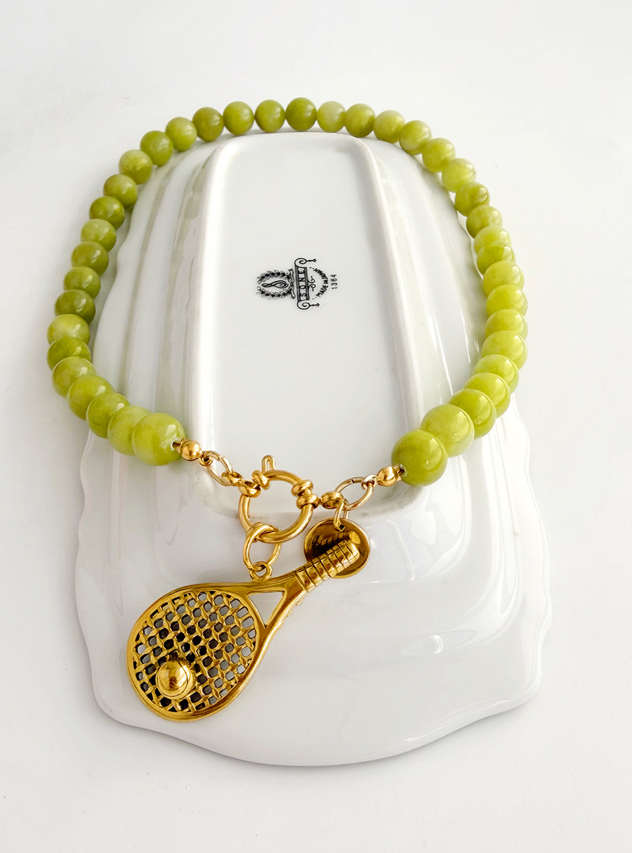 - На колье: идеально дополняет нити из цветных бусин (попробуйте сочетать с зелеными оттенками, чтобы поддержать эстетику теннисного корта).
